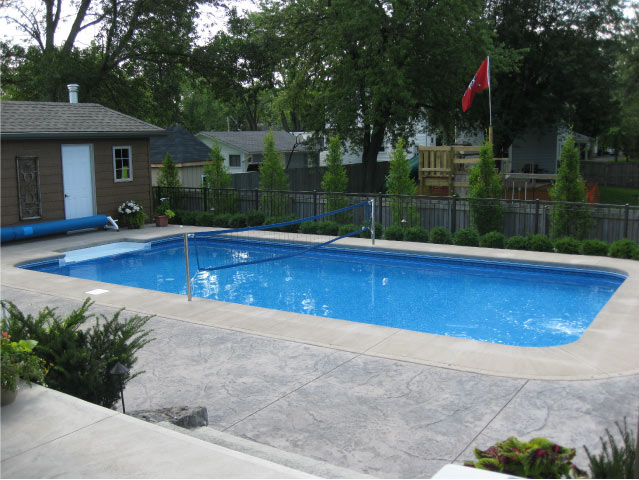 Stamped ConcreteStamped concrete at one time was a very popular choice for a walkway around the perimeter of a swimming pool. Experience has brought us to the conclusion that the consistant maintenance of having to clear coat this product each year and the slickness of the finish around the pools perimeter is not the best choice for this application. It is sugested to incorperate this product in a sitting area or an outdoor living space away from the pools edge, as this will elminate the need for any clear coating treatment near the pools vinyl or step. |